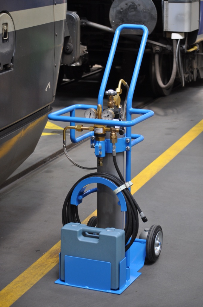 Zum Kontrollieren resp. Nachfüllen des Druckakkumulators der Hydraulikaggregate (Betätigung der Permanent-Magnetschienenbremsen) mit Stickstoff in den Lokomotiven Re 465 der BLS wird eine mobile Druckflasche mit entsprechenden Regulierventilen, Adaptern und einem Schlauch benötigt. Das Nachfüllen der Druckflasche kann direkt erfolgen.