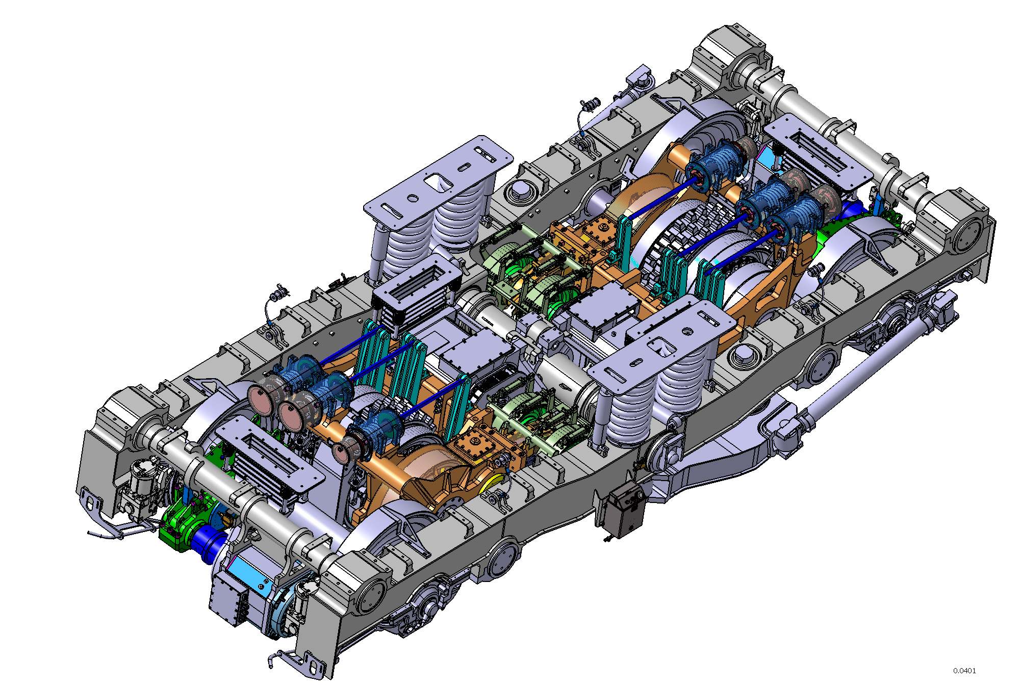 Für diese Lokomotiven entwickelten wir Drehgestelle, die hinsichtlich Grösse, Leistung und Ausführung die gewohnten Massstäbe übertrafen. Die Drehgestelle sind aufgrund des extrem grossen Achsstandes gelenkig aufgebaut, d. h. die Langträger können sich über Gleitlager gegenüber dem Querträger drehen. Die Anforderungen sahen die Integration zweier Adhäsions- und zweier Zahnradantriebe vor, dazu kamen 4 Klotzbremseinheiten.